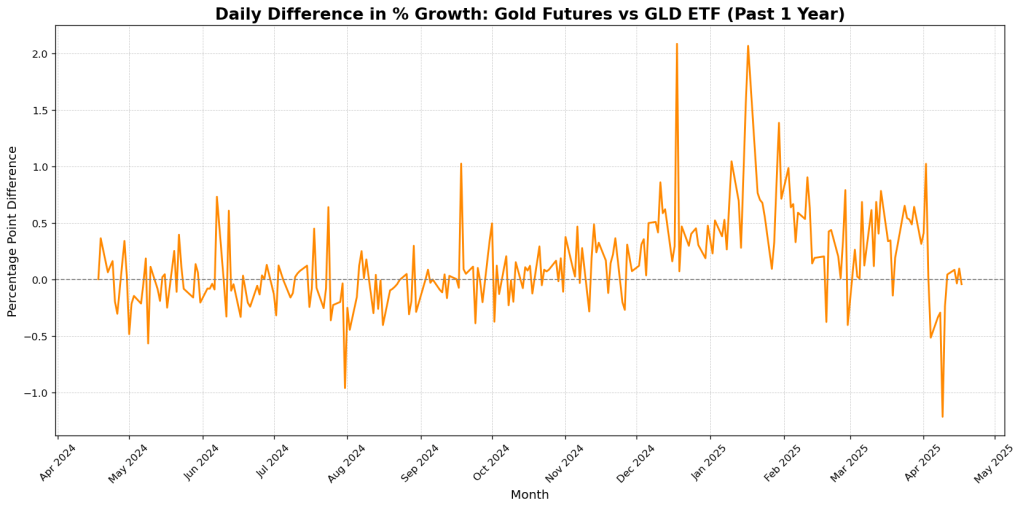 This paper investigates the percentage price changes and divergence between Gold Futures and the GLD ETF from April 2024 to April 2025. By exploring notable macroeconomic developments and analyzing daily percentage differences, we aim to understand the implications of global economic events on gold price behavior and ETF tracking accuracy.