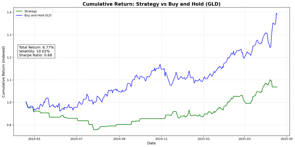 Despite periods of modest gains, the strategy underperformed the buy-and-hold benchmark over the past year. The strategy’s cumulative return is 6.77%, whereas the buy-and-hold portfolio on GLD achieved a return closer to 39%, as evident from the visibly steeper and more consistent upward trajectory of the blue line.